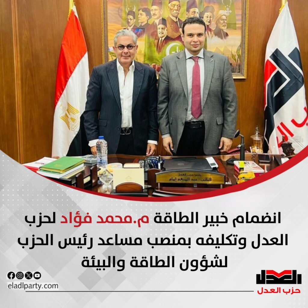 أعلن حزب العدل انضمام المهندس محمد فؤاد خبير الطاقة ورئيس مجموعة Egypt Oil and Gas، وذلك عقب لقاء جمعه ورئيس الحزب النائب عبد المنعم إمام، وتم الاتفاق على تكليفه بالإشراف على ملفي الطاقة والبيئة في الحزب.