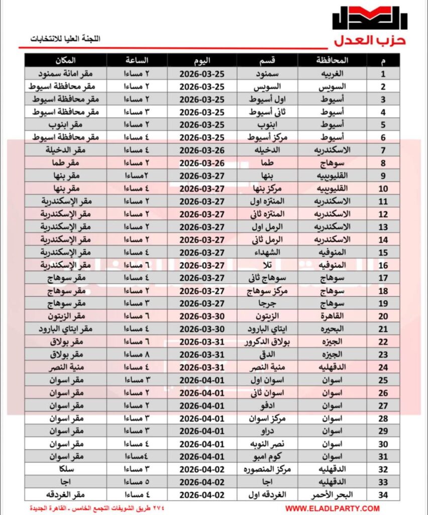 بيان صحفيالمتحدث الرسمي باسم اللجنة العليا للانتخابات بحزب العدل: انطلاق مؤتمرات الأمانات الأساسية واستمرار انعقادها وفق الجدول المعتمدالقاهرة –صرّح الأستاذ علي أبوحميد، المتحدث الرسمي باسم اللجنة العليا للانتخابات بحزب العدل، بأن اللجنة برئاسة الأستاذ عبدالغني الحايس تواصل تنفيذ الجدول الزمني لانعقاد مؤتمرات الأمانات الأساسية على مستوى الجمهورية، وذلك في إطار استكمال الاستحقاقات التنظيمية للحزب لعام 2026.وأوضح أبوحميد أن عددًا من مؤتمرات الأمانات الأساسية قد تم انعقادها بالفعل والانتهاء من إجراءاتها بنجاح خلال الأيام الماضية، وفقًا للجدول المعلن، بينما تتواصل حاليًا أعمال المؤتمرات في عدد من المحافظات الأخرى، على أن تُستكمل باقي المؤتمرات تباعًا حتى 3 أبريل 2026، وفق المواعيد المحددة لكل أمانة