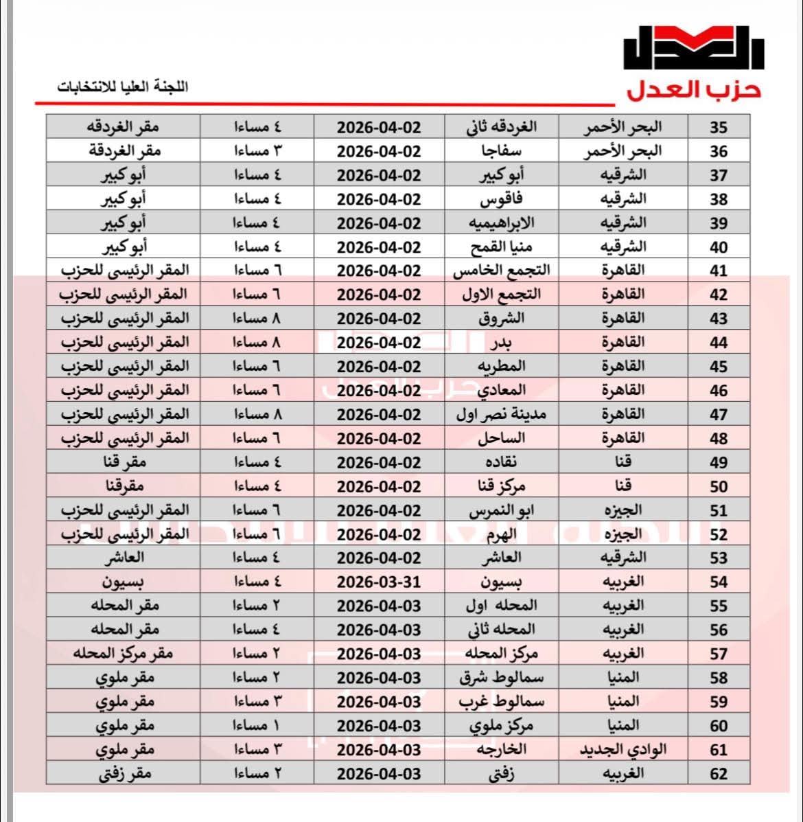 بيان صحفيالمتحدث الرسمي باسم اللجنة العليا للانتخابات بحزب العدل: انطلاق مؤتمرات الأمانات الأساسية واستمرار انعقادها وفق الجدول المعتمدالقاهرة –صرّح الأستاذ علي أبوحميد، المتحدث الرسمي باسم اللجنة العليا للانتخابات بحزب العدل، بأن اللجنة برئاسة الأستاذ عبدالغني الحايس تواصل تنفيذ الجدول الزمني لانعقاد مؤتمرات الأمانات الأساسية على مستوى الجمهورية، وذلك في إطار استكمال الاستحقاقات التنظيمية للحزب لعام 2026.وأوضح أبوحميد أن عددًا من مؤتمرات الأمانات الأساسية قد تم انعقادها بالفعل والانتهاء من إجراءاتها بنجاح خلال الأيام الماضية، وفقًا للجدول المعلن، بينما تتواصل حاليًا أعمال المؤتمرات في عدد من المحافظات الأخرى، على أن تُستكمل باقي المؤتمرات تباعًا حتى 3 أبريل 2026، وفق المواعيد المحددة لكل أمانة