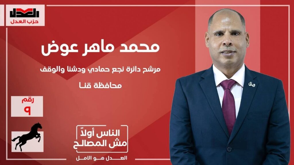 · المرشح محمد ماهر عوض: دائرة نجع حمادي ودشنا والوقف. (رقم 9 رمز الحصان)
