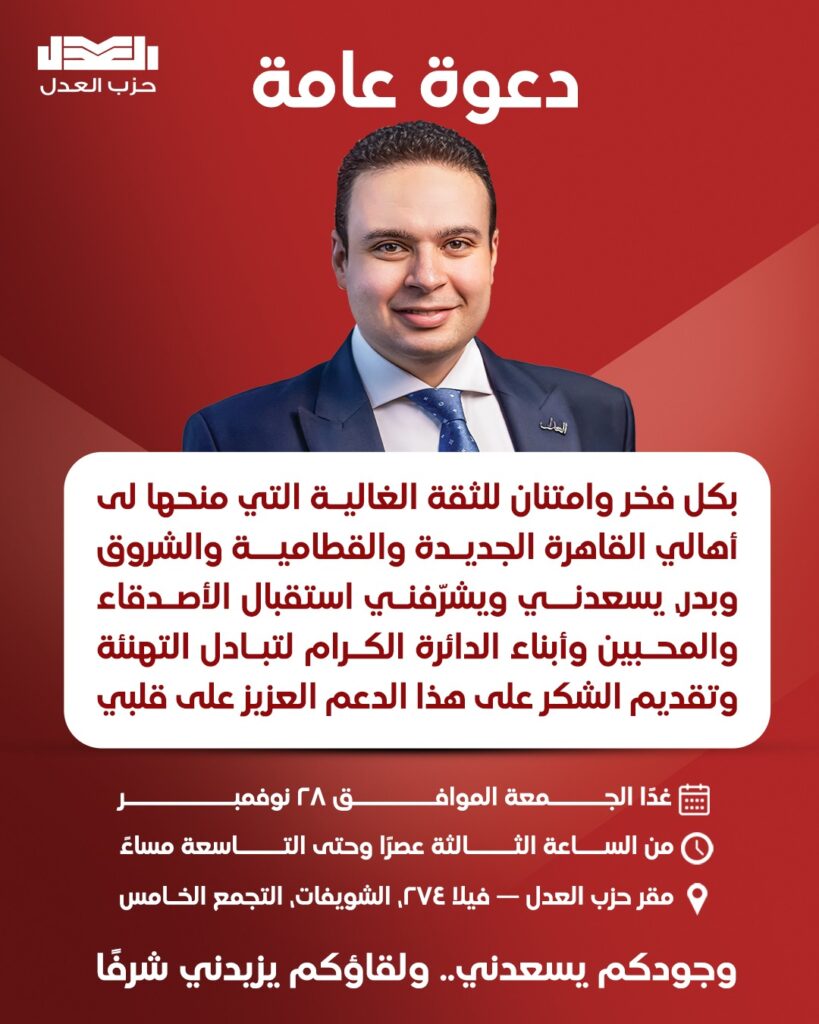 بكل فخر وامتنان للثقة الغالية التي منحها لى أهالي القاهرة الجديدة والقطامية والشروق وبدر، يسعدني ويشرّفني استقبال الأصدقاء والمحبين وأبناء الدائرة الكرام لتبادل التهنئة وتقديم الشكر على هذا الدعم العزيز على قلبي