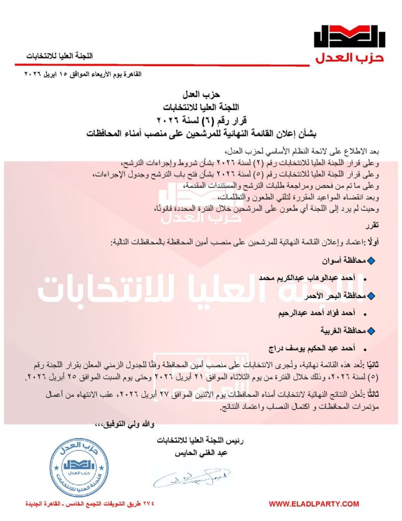 في إطار استكمال الاستحقاقات التنظيمية للحزب، أعلنت اللجنة العليا للانتخابات بحزب العدل برئاسة الأستاذ عبدالغني الحايس، عن القائمة النهائية للمرشحين على منصب أمناء المحافظات، وذلك بعد الانتهاء من فحص كافة أوراق الترشح والتأكد من استيفائها للشروط المنصوص عليها بلائحة النظام الأساسي، وانقضاء المدة المحددة لتلقي الطعون دون ورود أي طعون.