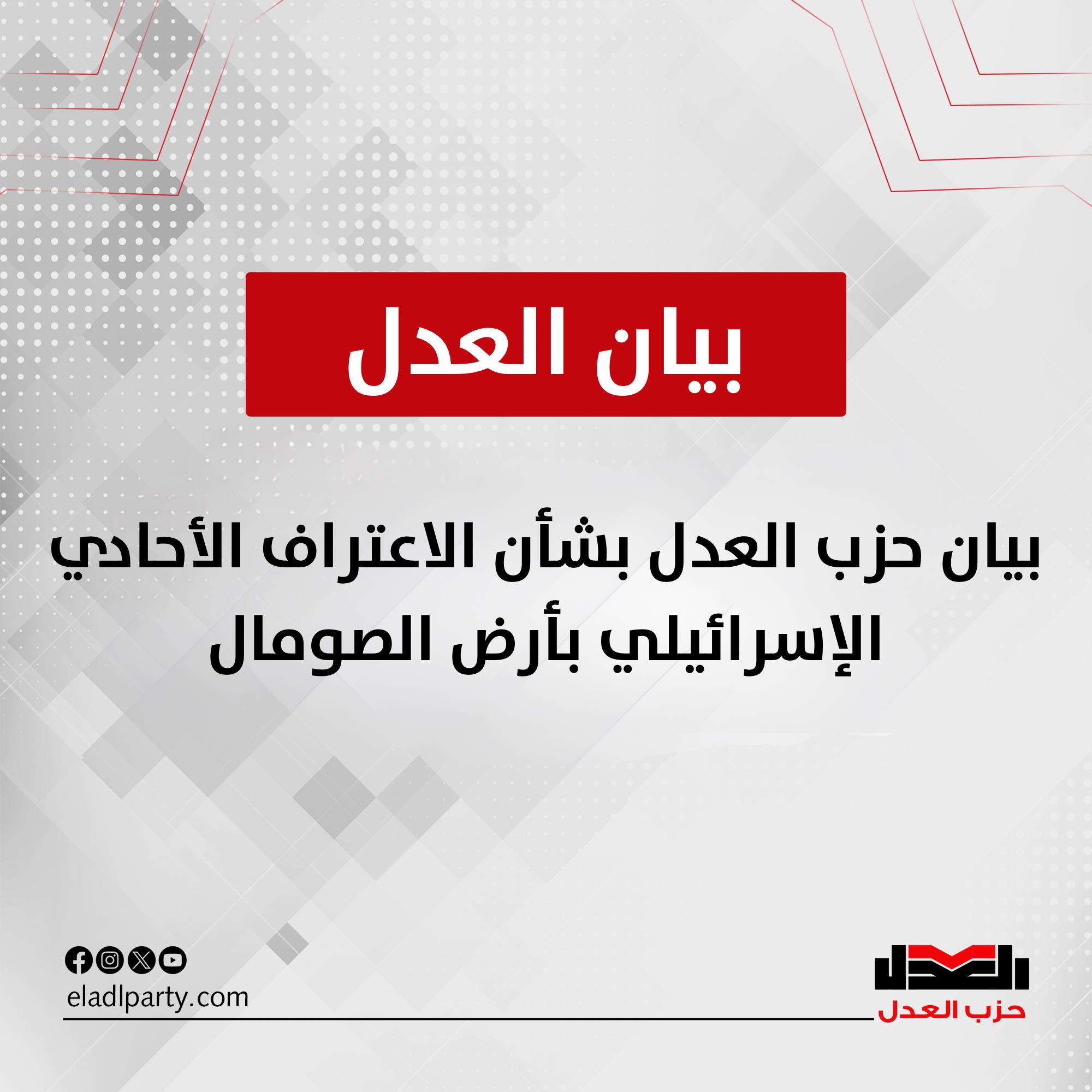 يستنكر حزب العدل بشدة الإعلان الأحادي لدولة الاحتلال الإسرائيلي بالاعتراف بما يعرف بـ”أرض الصومال” كدولة مستقلة، وذلك باعتباره خرقا صريحا لمبادئ القانون الدولي وميثاق الأمم المتحدة، وانتهاكا واضحا لسيادة جمهورية الصومال ووحدة أراضيها.