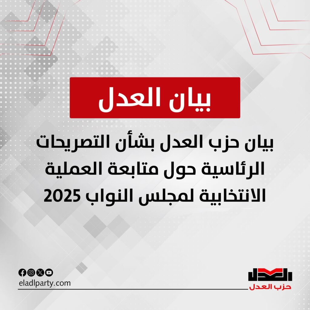 يُثمّن حزب العدل التصريحات الرئاسية التي تناولت سير العملية الانتخابية في المرحلة الأولى لانتخابات مجلس النواب، ويدعم ما تضمنته من وقوف السلطة التنفيذية على مسافة واحدة من جميع الاطراف وما حملته من توجيهات للهيئة الوطنية للانتخابات بأداء دورها الكامل في فحص الطعون وضمان شفافية العملية الانتخابية واحترام إرادة الناخبين.