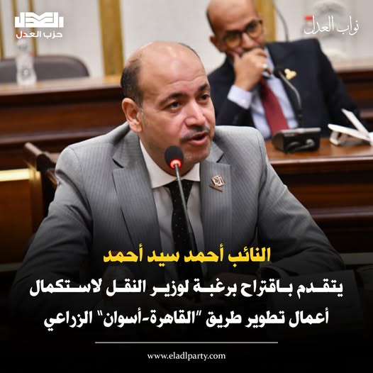 تقدم النائب “أحمد سيد أحمد”اقتراح برغبة موجه إلى وزير النقل بشأن استكمال أعمال تطوير طريق “القاهرة-أسوان” الزراعي