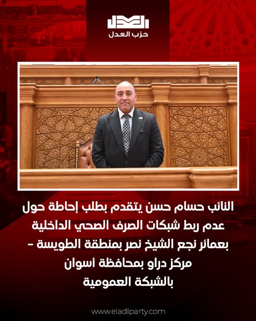 تقدم النائب “حسام حسن الخُشت”بطلب إحاطة لوزير الإسكان والمرافق والمجتمعات العمرانية، بشأن عدم ربط شبكات الصرف الصحي الداخلية بعمائر نجع الشيخ نصر بمنطقة الطويسة