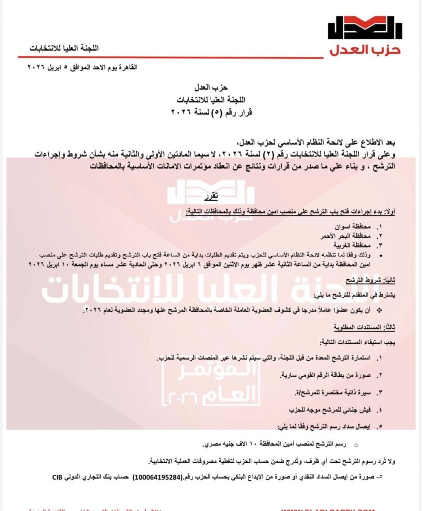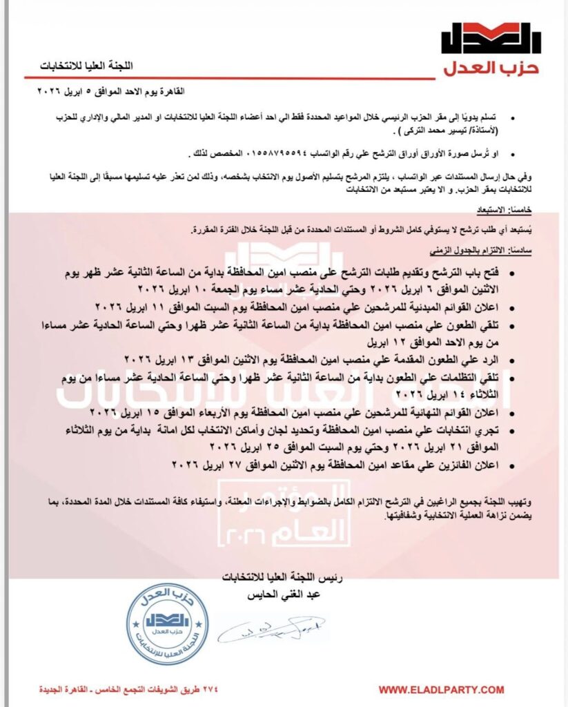 • اعلان القوائم المبدئية للمرشحين علي منصب امين المحافظة يوم السبت الموافق 11 ابريل 2026