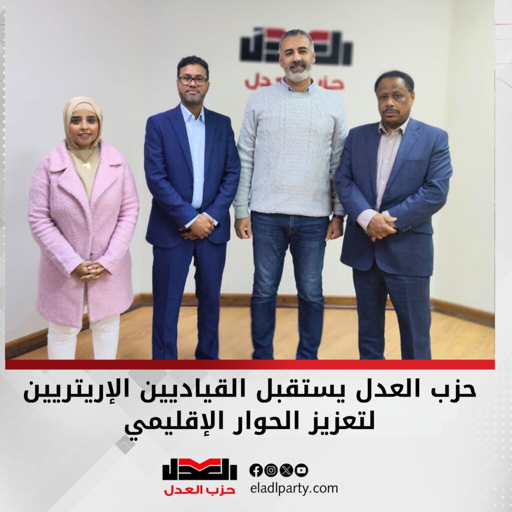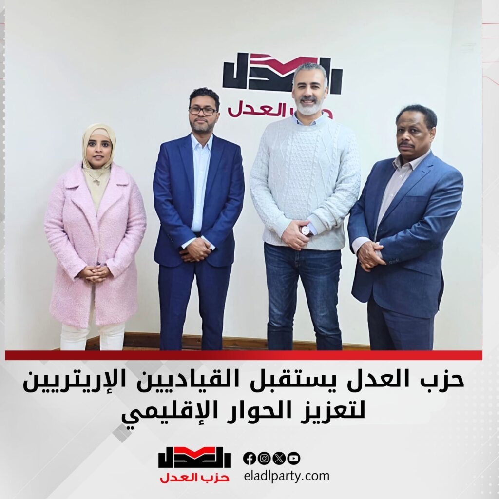 استقبل حزب العدل مؤخرًا القياديين الإريتريين السياسين الدكتور محمد علي شيا و الدكتور صابر رباط، بحضور الدكتور أحمد السيد، رئيس مكتب العلاقات الخارجية بالحزب، والكاتبة الصحفية راندا خالد، مسؤولة الشؤون الأفريقية بمكتب العلاقات الخارجية بالحزب.