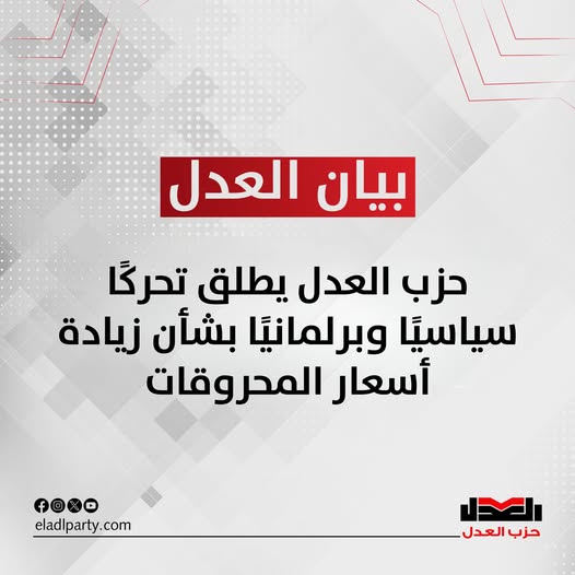 الرئيسيةبياناتحزب العدل يطلق تحركًا سياسيًا وبرلمانيًا بشأن زيادة أسعار المحروقات