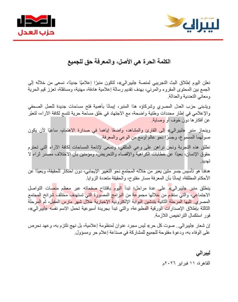 أعلن حزب العدل اليوم عن إطلاق البث التجريبي لمنصة «ليبرالي»، كمنبر إعلامي جديد يهدف إلى الجمع بين المحتوى المقروء والمرئي، وتقديم رسالة إعلامية هادفة ومهنية ومستقلة، تعزز قيم الحرية والتعددية والعدالة.