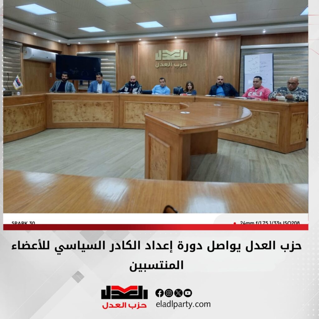 واصل حزب العدل فعاليات دورة إعداد الكادر السياسي، وذلك في إطار خطة الحزب لتأهيل كوادره وبناء عضوية فعالة، وتحويل الأعضاء المنتسبين إلى أعضاء عاملين قادرين على الانخراط الإيجابي في العمل الحزبي والمجتمعي.