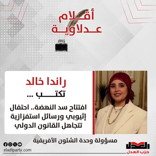 قد تكون صورة ‏‏شخص واحد‏ و‏تحتوي على النص '‏أقلام عدلاوية راندا خالد ...تكتب ••• افتتاح سد النهضة.. احتفال E إثيوبي ورسائل استفزازية تتجاهل القانون الدولي مسؤولة وحدة الشئون الأفريقية foxo eladlparty.com حل حزب العدل‏'‏‏