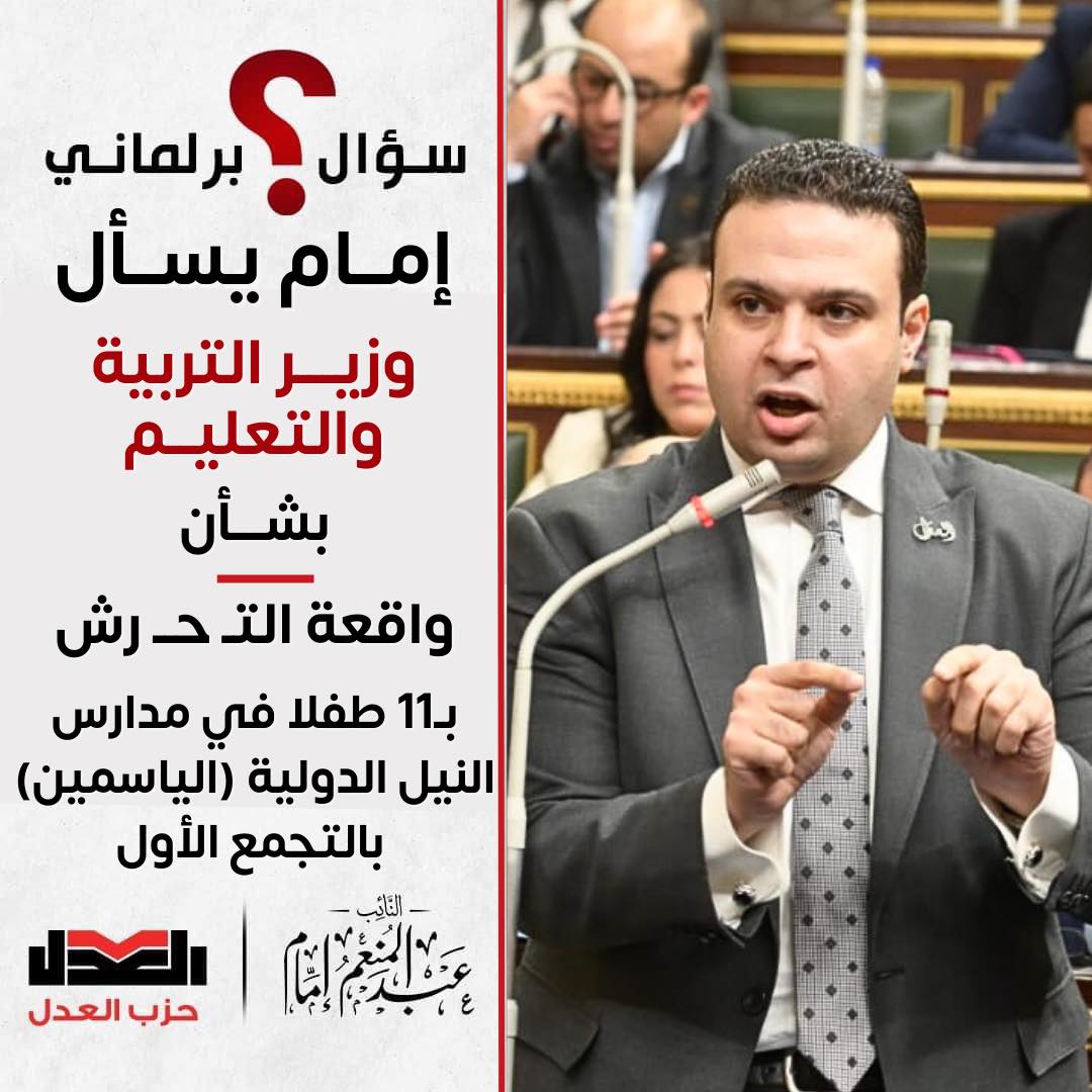 تقدّم النائب عبدالمنعم إمام، رئيس حزب العدل وعضو مجلس النواب، بسؤال برلماني إلى السيد المستشار الدكتور حنفي جبالي، رئيس مجلس النواب، موجّهًا إلى السيد وزير التربية والتعليم والتعليم الفني، بشأن واقعة تحرش خطيرة داخل مدارس النيل المصرية الدولية – فرع الياسمين بالتجمع الأول، وما كشفت عنه من إهمال جسيم وغياب للرقابة داخل مؤسسة تعليمية تابعة لمشروع قومي للدولة.