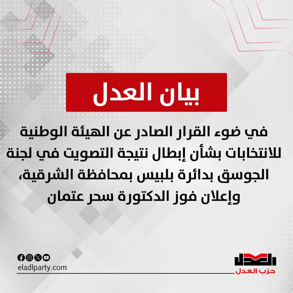ويختتم حزب العدل بيانه بالتأكيد على أن العدل ليس شعارًا سياسيًا، بل أساس الاستقرار، وجوهر العمل العام، والضمانة الحقيقية لاحترام إرادة المواطنين. وأن إيمان الحزب بالدفاع عن الحقوق السياسية لا ينفصل عن دفاعه عن حقوق الناس في صوتهم، وفي أن يُحتسب هذا الصوت صحيحًا، مصونًا، ومحميًا بإجراءات عادلة.