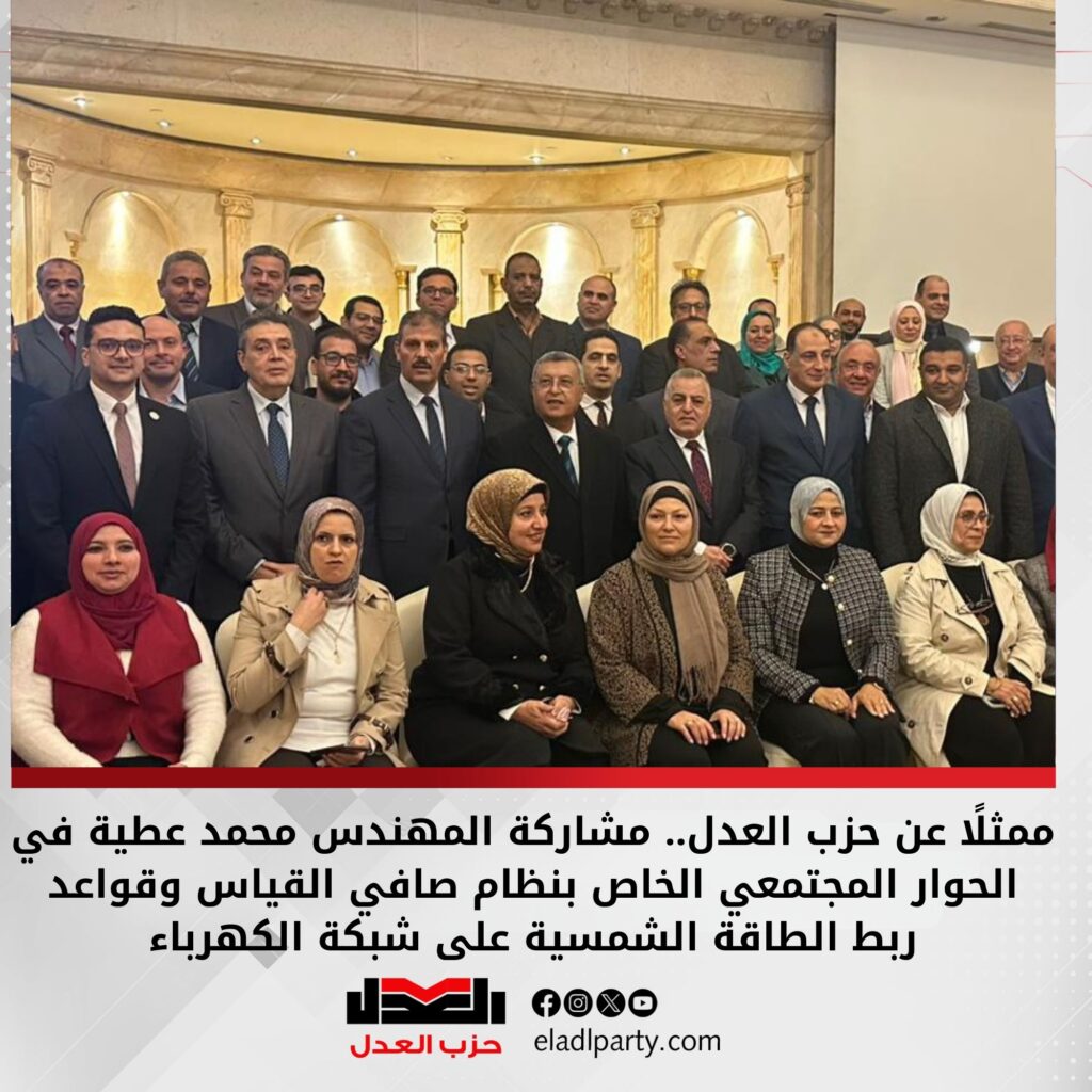 ممثلًا عن حزب العدل.. مشاركة المهندس محمد عطية في الحوار المجتمعي الخاص بنظام صافي القياس وقواعد ربط الطاقة الشمسية على شبكة الكهرباء