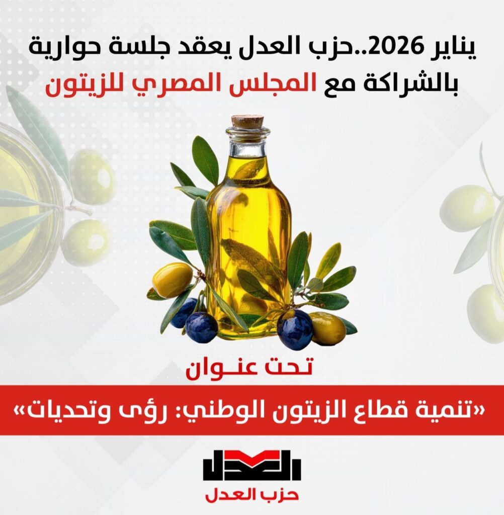 وفي هذا السياق، يعقد حزب العدل جلسة حوارية متخصصة خلال يناير القادم بالشراكة مع المجلس المصري للزيتون تحت عنوان «تنمية قطاع الزيتون الوطني: رؤى وتحديات»، لمناقشة تطوير قطاع الزيتون كمنظومة متكاملة تشمل الإنتاج والتصنيع والتسويق، ودعم المزارعين، وزيادة القيمة المضافة للمحصول.